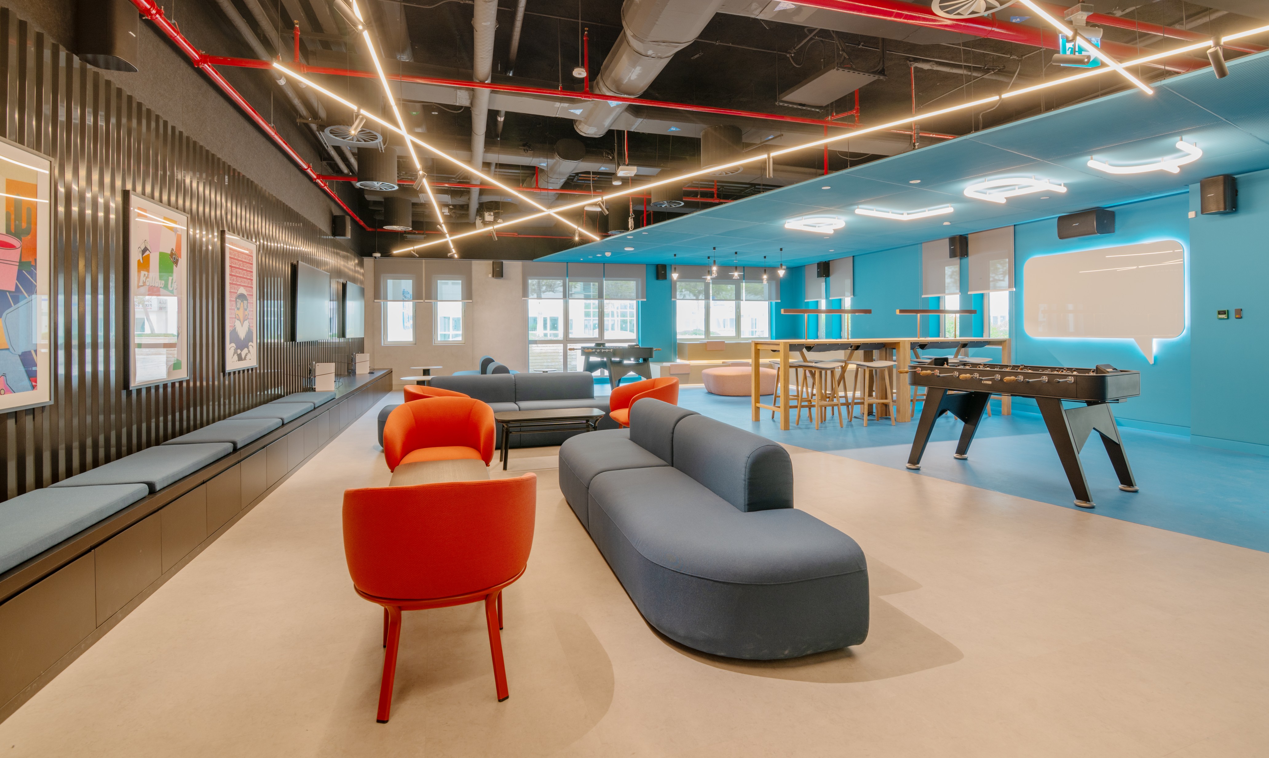 Expanding on the existing student hub in the main building, the revamped student hub features additional gaming systems with various lounge seating styles and collaboration facilities